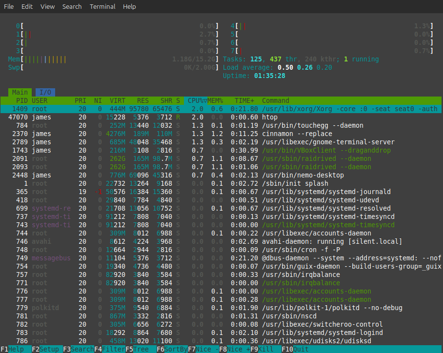 sudo apt install htopjames@silent:~$ htopBằng cách này ta có thể sort xem process nào chiếm nhiều RAM hay CPU để có hướng xử lý.