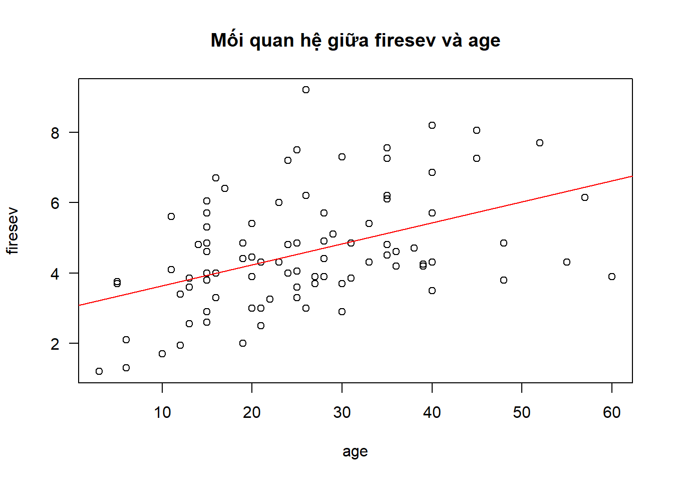 Bản chất mối quan hệ này, ta có thể phân tích theo kiểu hồi quy tuyến tính để tìm ra tác động của biến age với biến firesev, và đó cũng là một mô hình SEM (về cơ bản SEM là mô hình hồi quy tuyến tính).