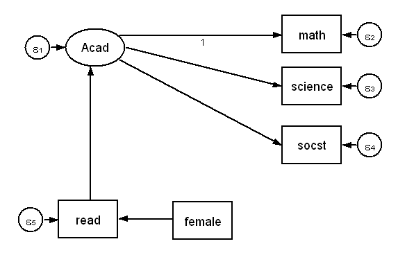 The dependent variable is a latent variable Acad with three observed indicators, math, science and socst.